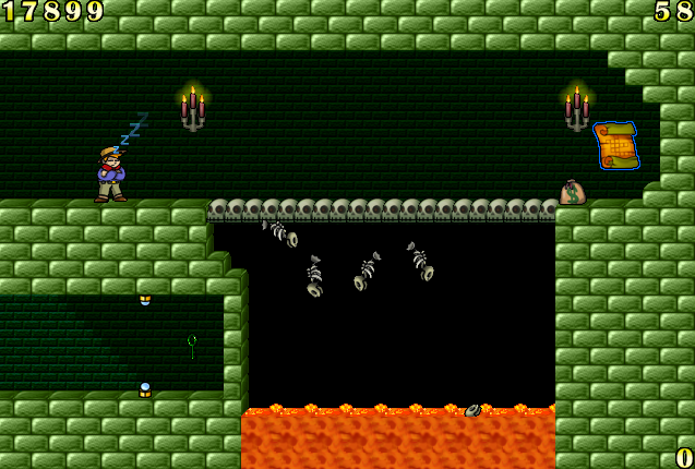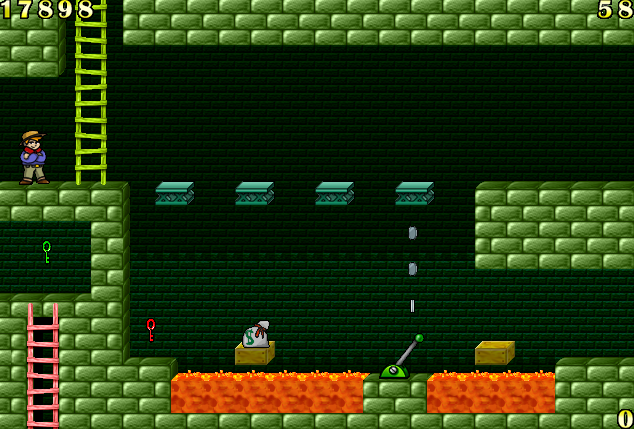 The room shown is number 17898 out of MM1 Falcon Manor hard. Jack may use the first sinking platform to the red key and jump to the moneybag on the yet not moving platform. There is no common way back! To continue the player needs to sacrifice a life by Jack jumping into the lava.
