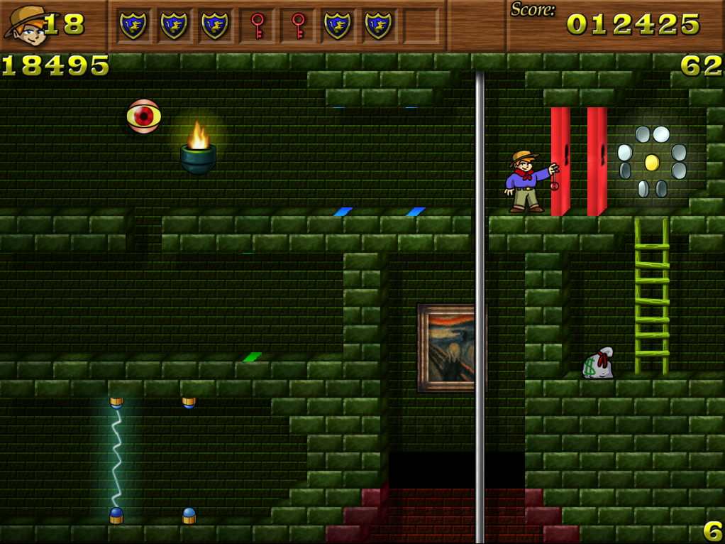 Jack Malone, who is becoming an addicted selfies-man, arrived at a place of interest (see pic). In room 18495 of MM1 HD - Falcon Manor easy he is standing between a pole down at the left and two red doors at the right. Since he has two red keys in his backpack the way to the right looks like the most obvious one, because there is $ 350 to pick up ànd an open way to at least one room at the right. Above that, the ladder is there to get back to the pole.