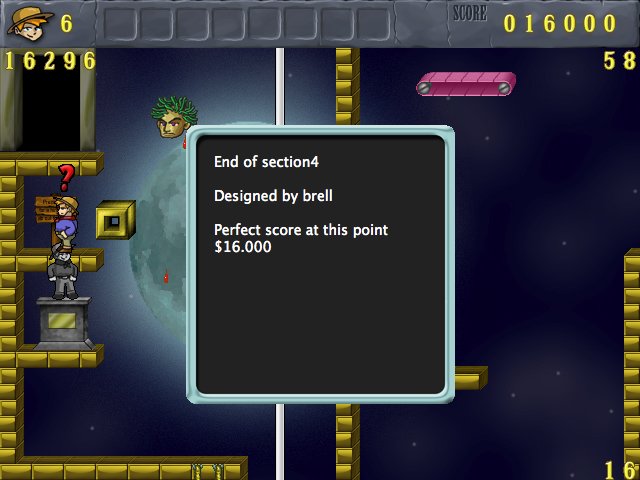 ![]() For the first time my Jack succeded in finishing with all money and all secrets (pic 1). I didn't check all your fixes. Later I will surely do that. But I took notes of 'things' I saw. First of all the sightseeing tour. If you want me to I like to do a thorough betatesting by jumping and falling all around. So far I always gave my Jack the time for a nap. 16899 The wooden platform also reveals during the sightseeing tour. 16699 Free suggestions: move the T to activate the platform slightly to the right and maybe add a coin at that spot. 16499 Very good improvement. 16498 HJS (pic 2) 16298 I like the fixing of the blue key issue very much. With typical brell-humour. Now that I know how this room works and where exactly that the Ts are, I handle it this way. Step 1:Jack takes the money bag and activate the platform. Step 3:Jack re-enters the room to remove the activated green pop-up block. Step 3:Jack activates the blue pop-up block and as soon as it reveals, he activates the red one as well. Step 4:Jack goes down in a 'normal' way by jumping left to the blue block and then right on the moving platform. Step 5: As soon as the red block reveals, Jack activates the green pop-up block. (to be continued)