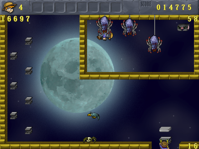 This room is cool because it gets complicated when the bird and the spider are moving together to the left (pic 1). 8-) 16897 My Jack did test the fixing of the HJS. A little bit later he died, reappeared in the upper right corner, used the sinking platform and jumped on the gold bricks. More rare but still a HJS. What is the sense of the golden moving platform. Once Jack is on it (pic 2) it takes a lot of time to get on the grey one again. And is pretty hard! 16896 I like the puzzle about how to avoid death by the skeleton. 16298 Resuming. IMO the room feels too hard. Is it an idea to keep it like it is, but add a sign in the URC with some help in case of not fitting pop-up blocks? Something like: 're-entering the room may help in case of problems'.