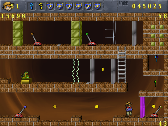 Jack came from the top floor where pulled the lever with the green knot to change the silver blocks into gold ones. Then he climbed down the ladder and jumped to the right to pick up a gold coin and the green key. When he arrived at the bottom floor he noticed that the key didn’t get a place in the inventory because of all the shields. He can’t get up in this room and in the two to the left he is also locked in.