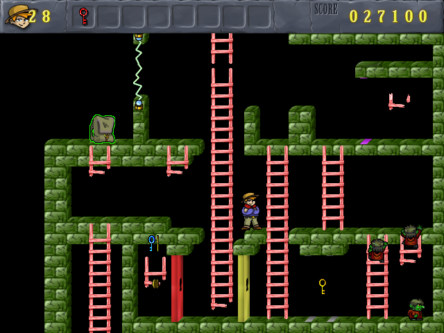 17093 The trolls. Two of them are rather slowly, one faster. Important: no u-turns on the ladders and not moving randomly: they follow there left hand. But they leave the room once the yellow door is opened. I assume that getting the purple key to open the purple door and getting the red key went well. Then you best bring Jack to the spot above the yellow door. See pic. Now, trolls (the more the better) on the ladder right of the yellow door are not important because Jack best goes down with the broken ladder at the right. Now just wait in the lower right corner of the room. It looks scary but trolls coming back from the ladder at the right of the yellow door are taking both other ladders up. So they will be out of view for a while.